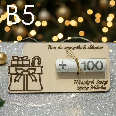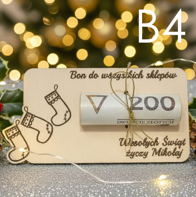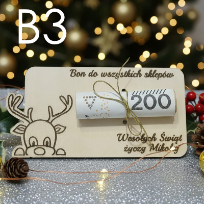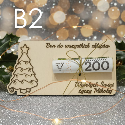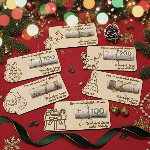 Bon wykonany jest z naturalnego drewna i zdobiony precyzyjnym grawerem laserowym z motywami bożonarodzeniowymi. Zwijany banknot (nie dołaczony do bonu) przewiązany złotym sznurkiem sprawia, że całość jest gotowym, stylowym upominkiem – bez dodatkowego pakowania.