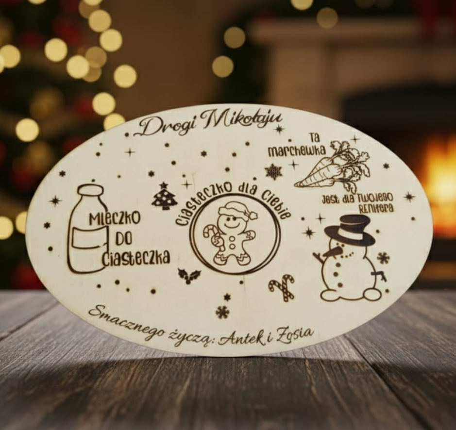 Spraw, aby wieczór wigilijny był naprawdę magiczny — oto Personalizowany "talerzyk" dla Mikołaja, stworzona ze sklejk i z naturalnego drewna i grawerowana laserowo z najdrobniejszymi detalami: mleczko do ciasteczka, marchewka dla renifera, sympatyczny bałwanek oraz uroczy pierniczek. Na dole możesz wygrawerować imiona (np. „Smacznego życzą: Antek i Zosia”) — tworzy to wyjątkową pamiątkę świąteczną dla dzieci i całej rodziny. Płytka ma owalny kształt, idealny rozmiar na ciasteczka i mleczko dla Mikołaja, a delikatny, naturalny kolor drewna idealnie wpisuje się w styl skandynawski i rustykalny.